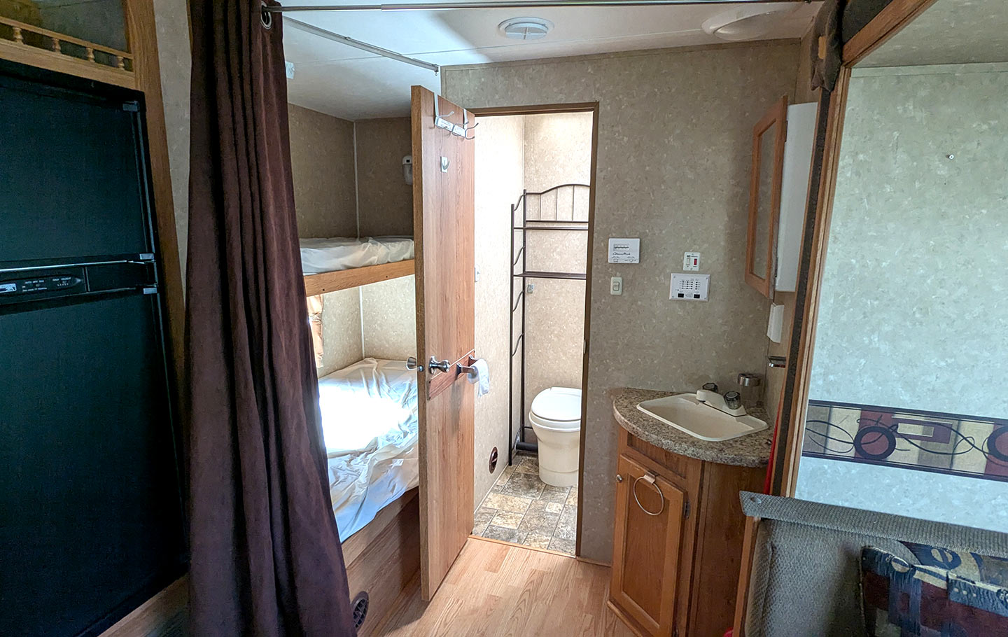 L’essentiel pour le campeur de luxe : micro-ondes, poêle, frigo, lit queen, 2 lits simples, salle de bain avec douche, table de patio, BBQ, feu de camp, etc.